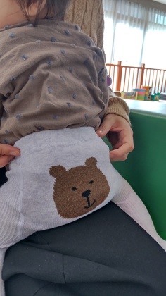暖かそうな帽子をパチリさせて頂きました。タイツの可愛いあんよは育児相談の赤ちゃん💕タイツも冬の暖かアイテムですね。